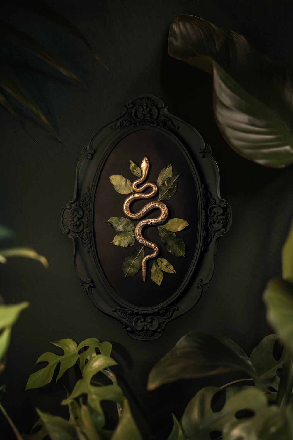 Handsculpted snake with 11 handsculpted leaves